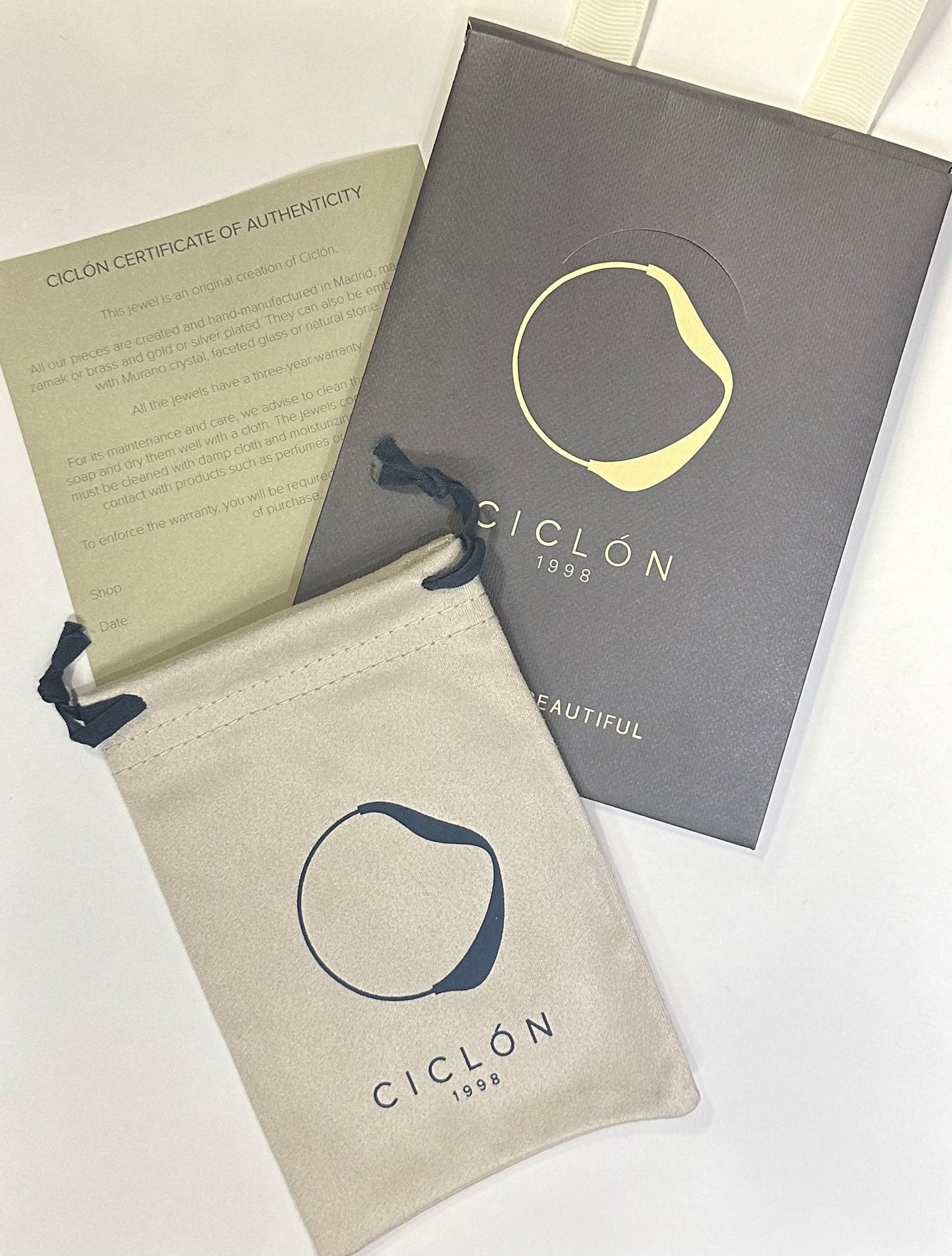 We must warn that the pieces and components of Ciclón jewelry can be deteriorated by contact with chemical substances such as alcohol and bleach, as well as creams, perfumes, detergents, etc., and it is advisable to avoid direct heat sources such as lights and radiators.